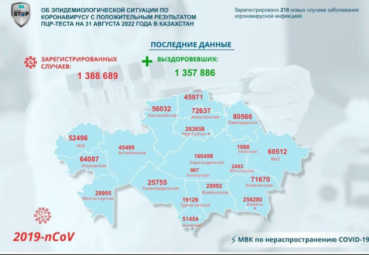В Казахстане за прошедшие сутки (31 августа) зарегистрировано 210 новых случаев заболевания коронавирусной инфекцией, передает Tengrinews.kz со ссылкой на МВК по нераспространению COVID-19.
