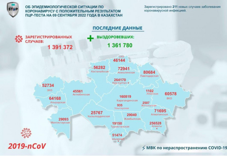 В Казахстане за прошедшие сутки зарегистрировано 211 новых случаев заболевания коронавирусной инфекцией, сообщает Tengrinews.kz со ссылкой на МВК по нераспространению COVID-19.