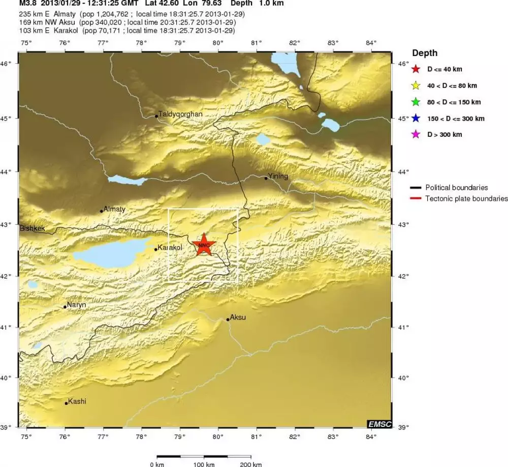 Напомним, в 16.03 в 28 километрах к юго-западу от Алматы произошло землетрясение магнитудой 4. Также в 14.57 было зарегистрировано еще одно землетрясение. Эпицентр подземных толчков магнитудой 5 был расположен в 261-м километре к востоку от Алматы на глубине 5 километров. В городе подземные толчки ощущались силой 2-3 балла.