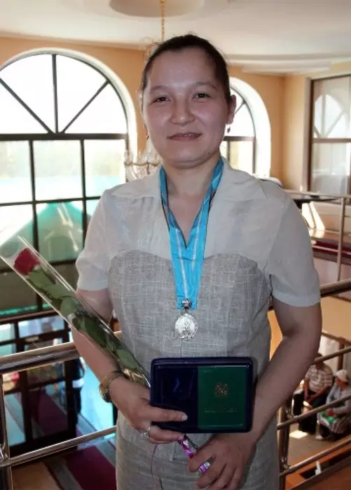 Назира Сабралиева за шесть лет замужества родила семерых детей. Сейчас ей 26, старшей дочери пять, младшему сыну пять месяцев. Особый знак отличия за материнство Сабралиевой вручил лично аким города Мархабат Жайымбетов.