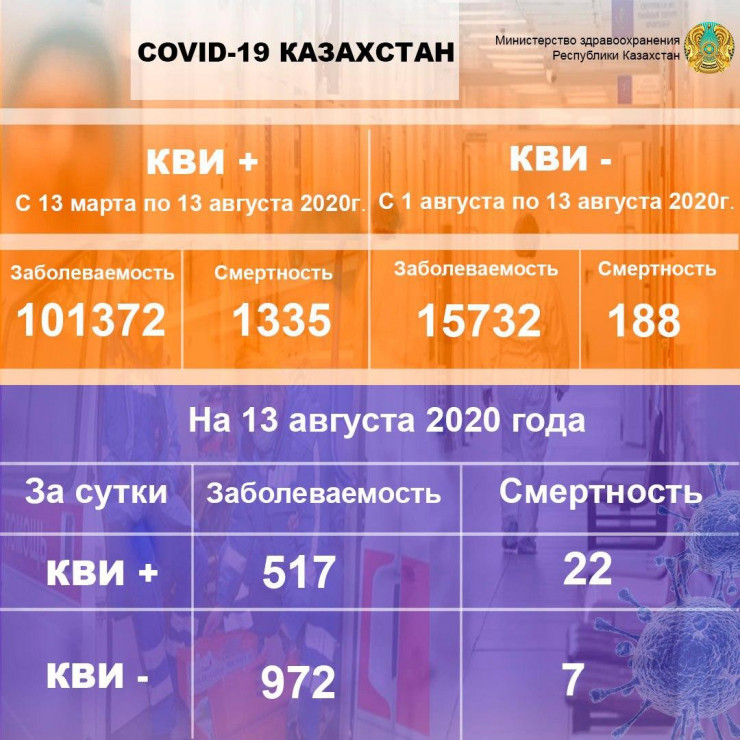 Ранее сообщалось, что за сутки COVID-19 выявили у 517 казахстанцев. Общее число инфицированных выросло до 101 372.
