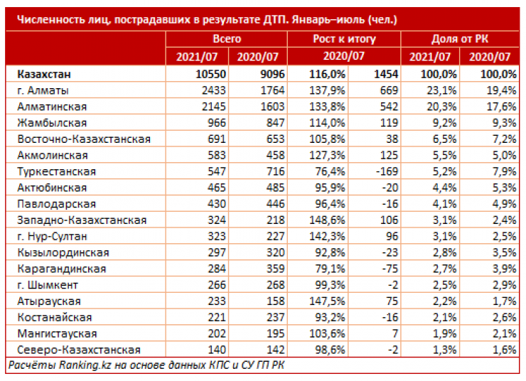 С января по июль 2021 года в авариях в Казахстане пострадало 10,6 тысячи человек (плюс 16 процентов за год). Численность раненых по сравнению с первым полугодием прошлого года выросла на 15,8 процента, до 9,5 тысячи человек.