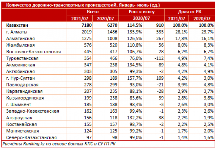По данным статистики, с января по июль 2021 года в Казахстане случилось 7,2 тысячи дорожно-транспортных происшествий, что на 14,5 процента больше, чем годом ранее. 3 из 10 ДТП в стране приходится на Алматы, передает корреспондент Tengrinews.kz со ссылкой на ranking.kz.