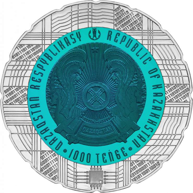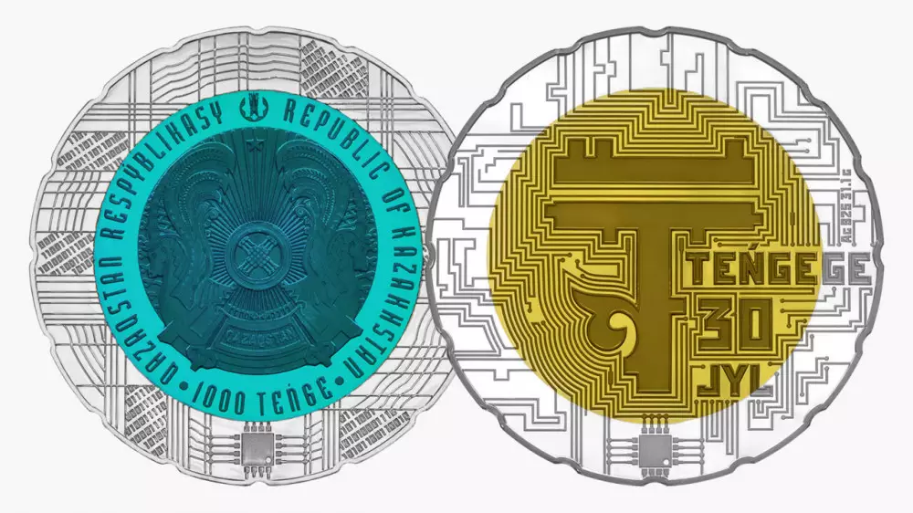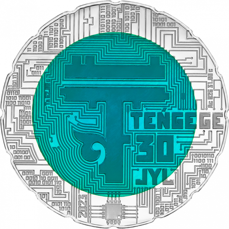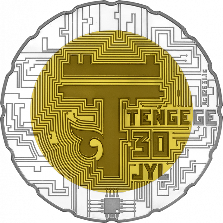 Дизайн монеты TEŃGEGE 30 JYL основан на использовании знака тенге "₸" в контексте развития цифровых технологий. Орнамент слева от знака символизирует развитие и рост, а также национальную идентичность и колорит. Коллекционные монеты TEŃGEGE 30 JYL изготовлены из серебра 925/1000-й пробы со вставкой из тантала. Диаметр монеты – 50 миллиметров, качество изготовления – proof, номинал – 1 000 тенге, тираж – 300 штук, общая масса монеты составляет 84,32 грамма.