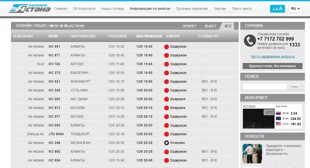 "На данный момент из аэропорта Астаны задерживаются 36 рейсов, из которых 18 рейсов на прилет и 18 рейсов на вылет. На прилет пять рейсов по направлению из Атырау, два рейса из Алматы. Из Кызылорды и Бишкека ушли на запасной аэродром в Караганде. Из задержанных авиарейсов на прилет четыре международных рейса задерживаются. Это по направлениям Екатеринбург, Новосибирск, Франкфурт, Бишкек", - сообщила начальник отдела маркетинга и связям с общественностью аэропорта Людмила Копейчук.