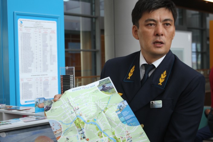 "Чаще всего спрашивают про EXPO, какая там программа, что можно там посмотреть. Также интересуются маршрутами по городу, как и куда можно проехать. Также часто мы оказываем гостям помощь в бронировании отелей. Кроме того, мы бесплатно раздаем путеводители по Астане, карты города с достопримечательностями. Для тех людей, которые прибывают из-за границы, предоставляются бесплатные мобильные номера", - рассказывает работник информационного киоска.