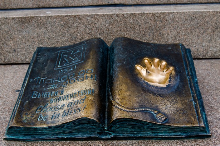 Бронзовая книга с отпечатком ладони Президента РК. В книге написано: "Выбирай и блаженствуй". Фото © Жасулан Нуркасымов