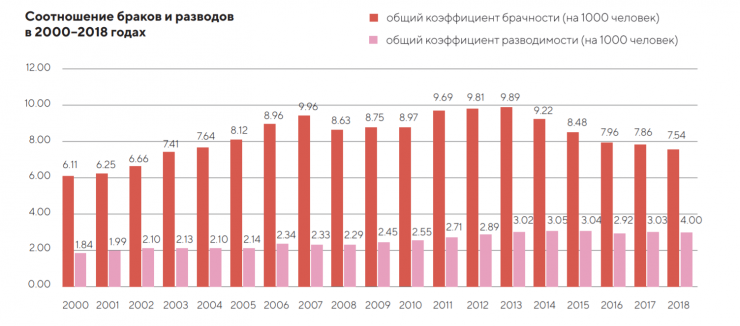 "Если в 2000 году в стране число разводов составляло 30 процентов от числа браков, то в 2018 году это соотношение ухудшилось, увеличившись до 40 процентов. При сохранении такой динамики соотношения браков и разводов в перспективе будет распадаться более одной трети браков, что может отрицательно сказаться на числе вторых и последующих рождений", - отмечается в анализе.