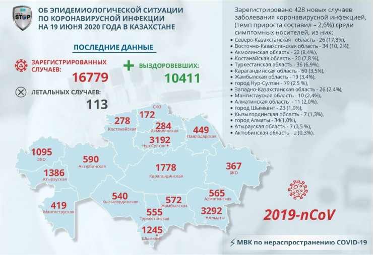 За прошедшие сутки (19 июня) в Казахстане выявлено 428 заболевших коронавирусной инфекцией, сообщает Tengrinews.kz.
