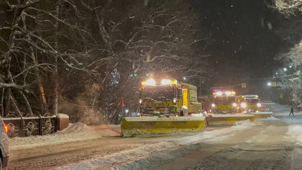 Всего с 16 декабря из Алматы вывезли 46 тысяч кубических метров снега. На улицах города работали 1034 дорожных рабочих днем и 957 - ночью.