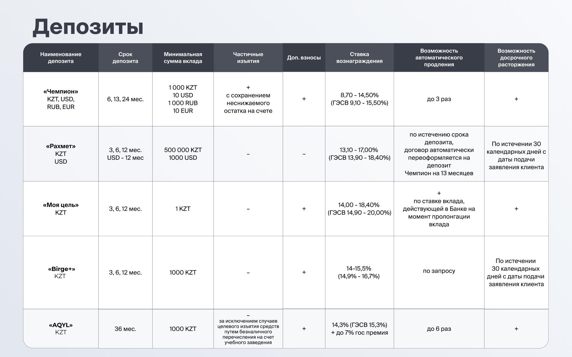 Нужен свободный доступ к деньгам – "Чемпион". Хотите сохранить капитал – "Рахмет". Копите крупную сумму под высокий процент или на конкретную покупку – "Моя цель". Думаете о будущем ребёнка – AQYL с государственной поддержкой. Копите всей семьёй – Birge+.