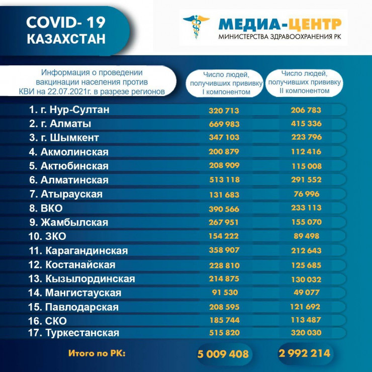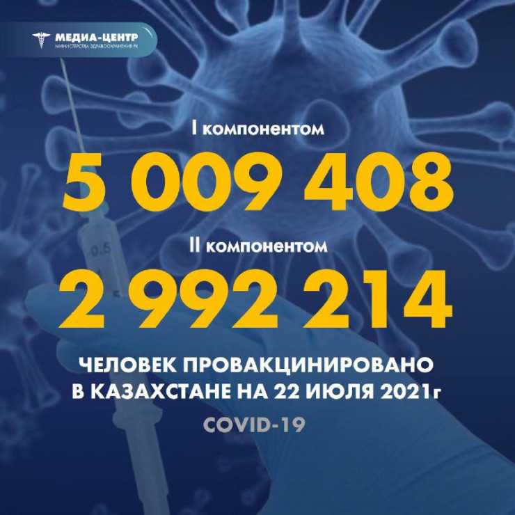 "I компонентом 5 009 408 человек провакцинировано в Казахстане на 22 июля 2021 года, II компонентом - 2 992 214 человек", - говорится в сообщении Минздрава.