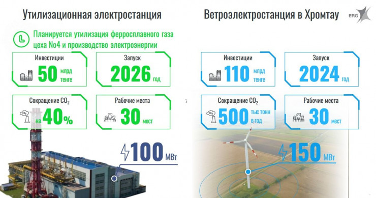 Еще более 110 миллиардов тенге ERG вкладывает в строительство ветроэлектростанции мощностью до 155 мегаватт. Парк ветрогенераторов расположится на 150 гектарах около города Хромтау. По словам Шахажанова, запуск ВЭС позволит предотвратить более чем 500 тысяч тонн в год выбросов СО2 в атмосферу.