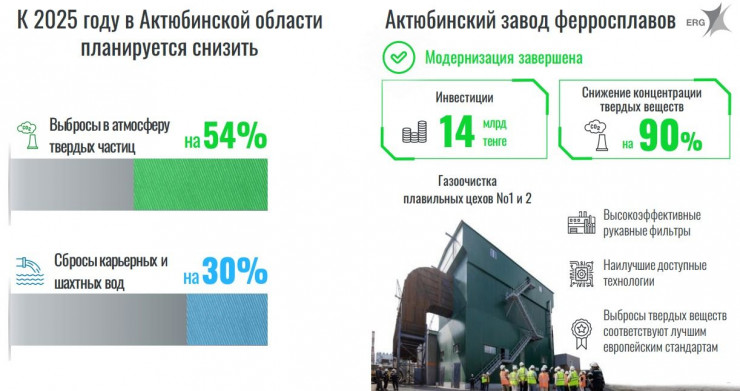 Как рассказал Шахажанов, группа активно инвестирует в экологическую стратегию, которая уже дает первые результаты. Так, за два года на предприятиях ERG выбросы твердых веществ сократились на 8 процентов. Уровень сбросов загрязняющих веществ снизился на 19 процентов, а потребление технической воды – на 10 процентов. К 2025 году планируется снизить вредные выбросы в атмосферу вполовину и почти на треть – сбросы карьерных и шахтных вод.