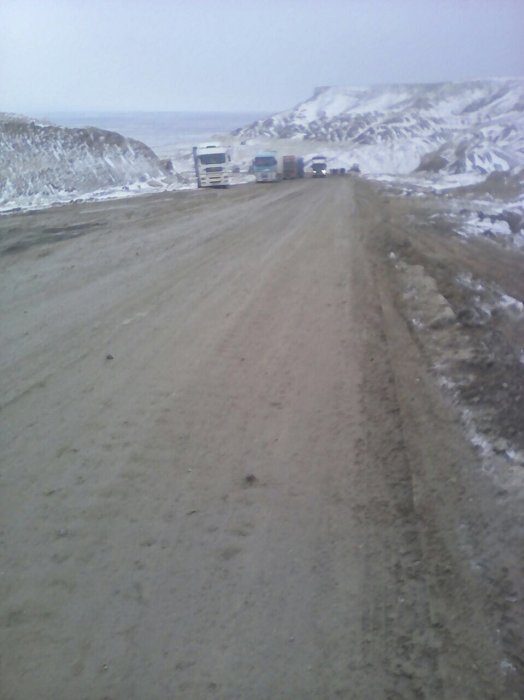 На подъеме Маната (Манаты Ата) на автотрассе между Шетпе и Бейнеу из-за непогоды большегрузные фуры попали в затор. По словам дальнобойщиков, они не могут сдвинуться с места.