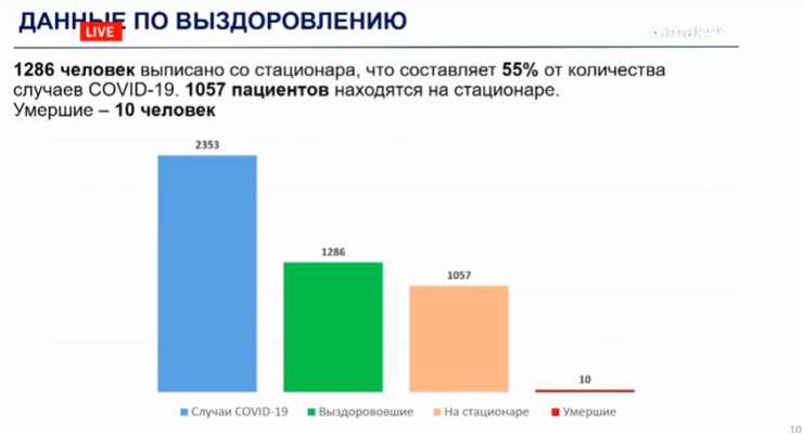 "В Алматы на сегодня 1286 человек выписаны, что уже составляет 55 процентов от общего количества случаев. При этом умерших - 10 человек", - отметил Бакытжан Сагинтаев.