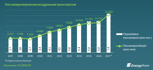 Авиакомпании в РК - в зоне активного роста. Доходы от авиаперевозок увеличились сразу на 27 процентов за год и достигли по итогам 2017 года 295,6 миллиарда тенге - это уже 12,5 процента от совокупных доходов транспортных компаний против 10,5 процента в 2016 году.