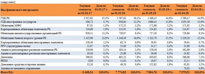 Отмечается, что по состоянию на 1 апреля 2018 года текущая стоимость портфеля пенсионных активов ЕНПФ равна 7 975,51 миллиарда тенге - увеличение на 90,75 миллиарда тенге за месяц и на 200,69 миллиарда тенге с начала года. Напомним, что за прошлый год пенсионный портфель ПА увеличился на 1 306,48 миллиарда тенге (+20,2 процента).