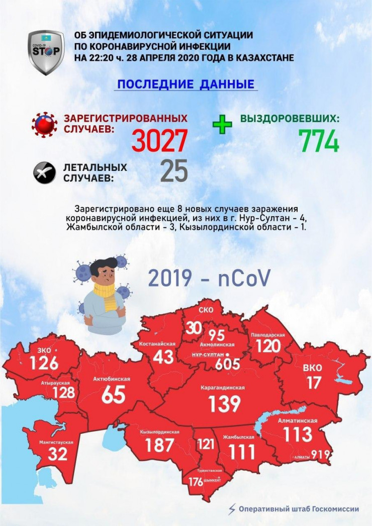 По состоянию на 22:20 28 апреля в Казахстане выявили еще 8 новых случаев заражения коронавирусной инфекцией, передает Оперативный штаб Госкомиссии.
