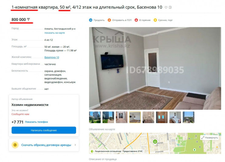 Так, в Telegram-канале Qumash опубликован скрин объявления с одного из популярных казахстанских сайтов. Согласно обнародованной информации, хозяин однокомнатной квартиры в Бостандыкском районе Алматы просит 800 тысяч тенге в месяц.