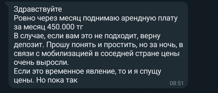 А вот пользователь Twitter под ником @thisisalanskiy показал уведомление, которое прислал хозяин одной из арендных квартир. В сообщении указывается, что "в связи с мобилизацией в соседней стране" он вынужден поднять стоимость аренды до 450 тысяч тенге в месяц.