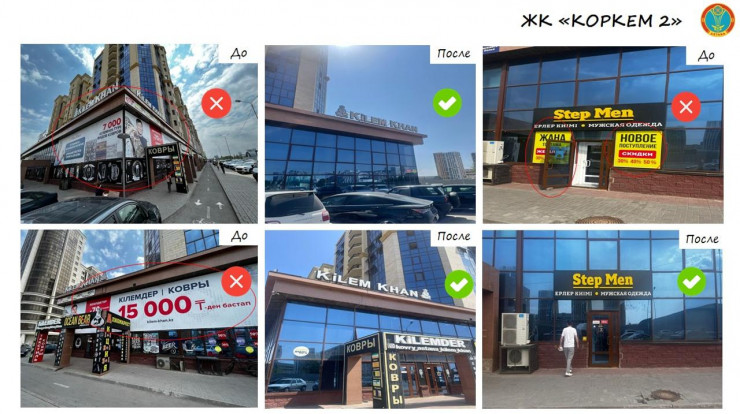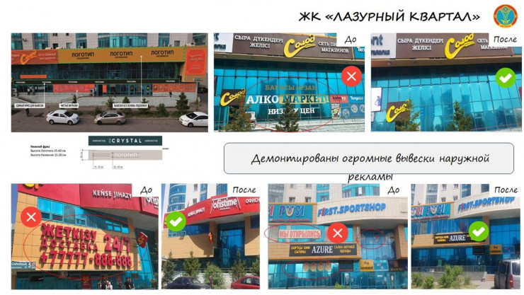 "На сегодня демонтированы 870 рекламных элементов, которые не соответствовали утвержденному дизайн-коду. Для устранения подобных нарушений собственникам малого и среднего бизнеса раздаются уведомления о приведении в соответствие наружной рекламы", - сообщается на сайте городского акимата.
