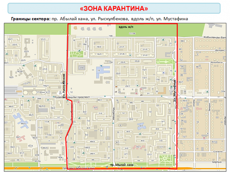 Жителям данных домов запрещается выходить из дома, только в близлежащие продмагазины, лекарства - с заказом на дом. Силами военных на участке проводится масштабная работа по дезинфекции. Данный участок был взят на карантин в силу того, что за короткий промежуток времени пациенты, у которых диагностировали коронавирус, проживали в квадрате улиц Абылай хана – Рыскулбекова – Мусрепова – Мустафина", - сообщили в акимате.