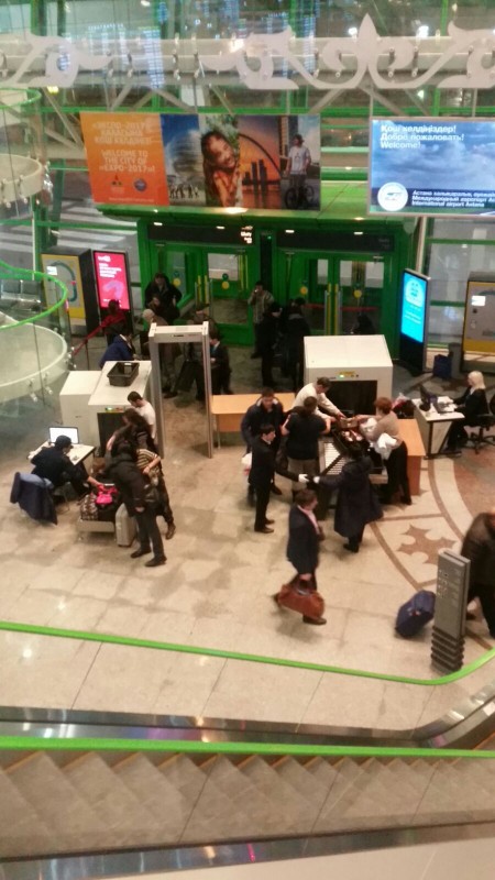 Первая линия досмотра установлена в аэропортах: Астаны, Алматы, Актобе, Актау, Атырау, Тараза, Шымкента, Усть-Каменогорска, Костаная и Кокшетау. Планируется установка первой линии досмотра во всех остальных аэропортах. Для проверки ручной клади пассажиров и грузобагажа установлены стационарные металлоискатели системы "Рапискан" при входе в здания. В случае выявления запрещенных к провозу предметов приглашаются сотрудники транспортной полиции для принятия соответствующего процессуального решения.