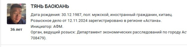 В ответ на официальный запрос редакции Tengrinews.kz в ведомстве сообщили, что в производстве департамента экономических расследований по городу Астане находится разыскное дело в отношении Тянь Баоюаня.