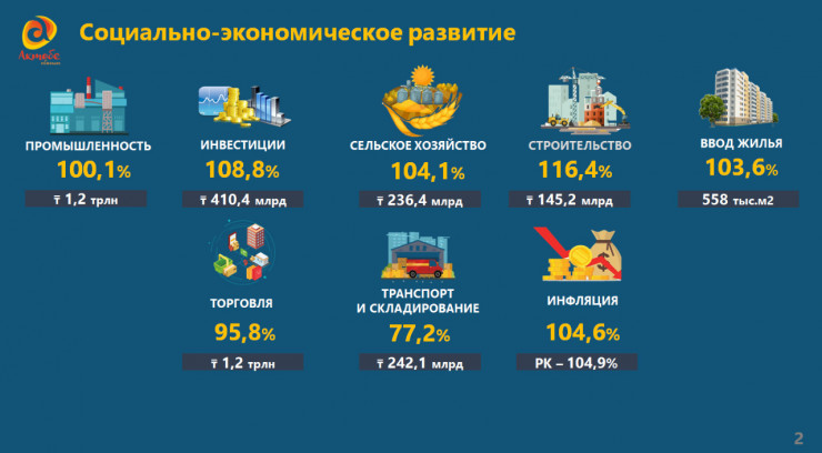 "Реализуется 26 крупных инвестпроектов стоимостью 140,2 миллиарда тенге, с созданием более 1200 рабочих мест. 7 проектов на сумму 54,5 миллиарда тенге уже введены в эксплуатацию. В их числе строительство ветровой электростанции "Бадамша-1" ТОО ARM wind, завода по производству стройматериалов и силикатного кирпича АО "Коктас-Актобе", цеха по производству твердо молотого наполнителя ТОО Alina Holding, комбикормового завода ТОО Milker и другие. Работа по привлечению инвестиций продолжится и в 2021 году, в том числе за счет реализации 18 проектов на сумму 150 миллиардов тенге с созданием более 2200 рабочих мест", - сообщил Ондасын Уразалин.