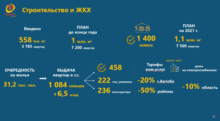 "Наша основная задача - это улучшение благосостояния граждан, обеспечение их работой и стабильным заработком. В связи с введением ЧП и ограничительных мер 520 тысяч жителей области получили социальные выплаты на сумму 20 миллиардов тенге. Было создано порядка 20 тысяч новых рабочих мест, в том числе около 11 тысяч постоянных", - добавил спикер.