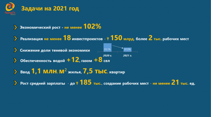 "Основная задача, над решением которой мы будем работать в следующем году, - восстановление положительных темпов экономического роста на уровне не менее 102 процентов. Для обеспечения стабильного роста и диверсификации экономики в последующие годы в 2021 году планируем реализовать как минимум 18 инвестпроектов на сумму порядка 150 миллиардов тенге. Будет отремонтировано не менее 600 километров дорог, питьевой водой обеспечим 12 населенных пунктов, природным газом – 8", - заключил аким Актюбинской области Ондасын Уразалин.