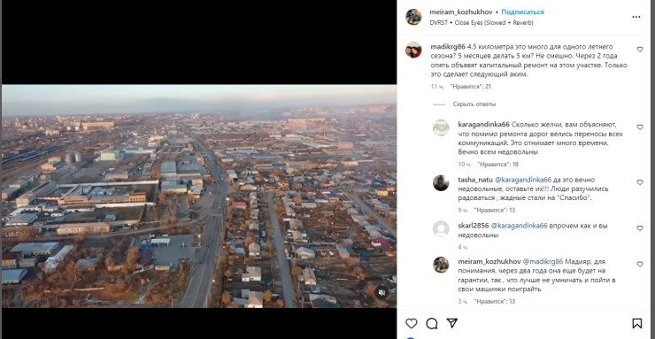 Видео отремонтированной дороги аким города опубликовал у себя на странице в Instagram. Под публикацией пользователи оставляют комментарии с благодарностью, однако некоторые высказываются с критическими замечаниями.
