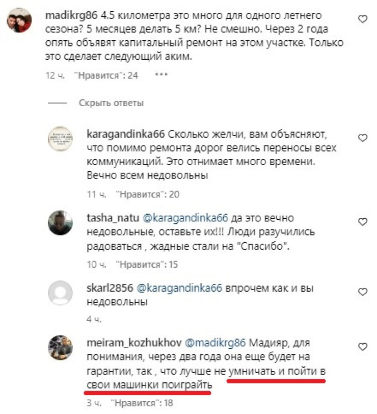 "4.5 километра это много для одного летнего сезона? 5 месяцев делать 5 км? Не смешно. Через 2 года опять объявят капитальный ремонт на этом участке. Только это сделает следующий аким", - написал один из пользователей под постом акима Караганды (орфография и пунктуация автора сохранены).