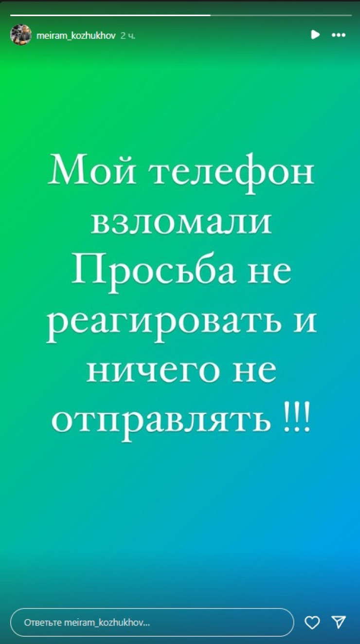 Аким Караганды Мейрам Кожухов в субботу сообщил на своей странице в Instagram о взломе своего телефона, передает Tengrinews.kz.
