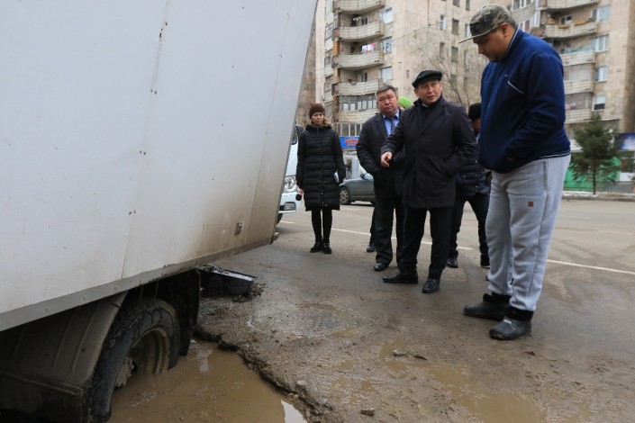 "Как раз мы сюда ехали на эту яму, и тут грузовик провалился, прямо как по заказу", - отметил аким Павлодара, выйдя из служебного авто. Не дожидаясь эвакуатора, градоначальник вместе с подчиненными пытался вытолкнуть попавший в яму фургон. Однако сдвинуть с места грузовик не удалось.