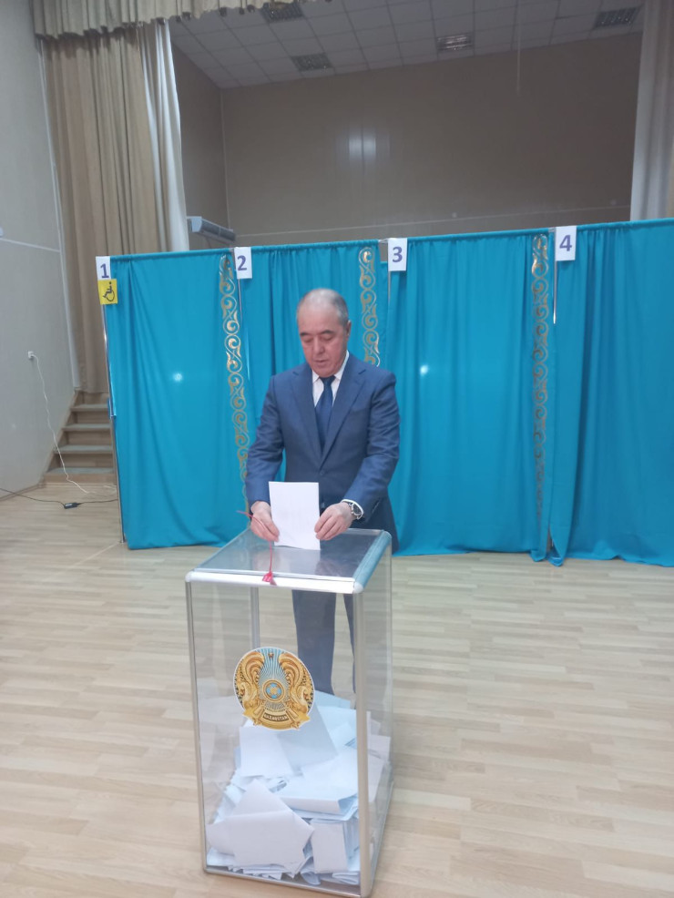 Аким Западно-Казахстанской области Нариман Турегалиев проголосовал на участке в колледже информационных технологий в городе Уральске.