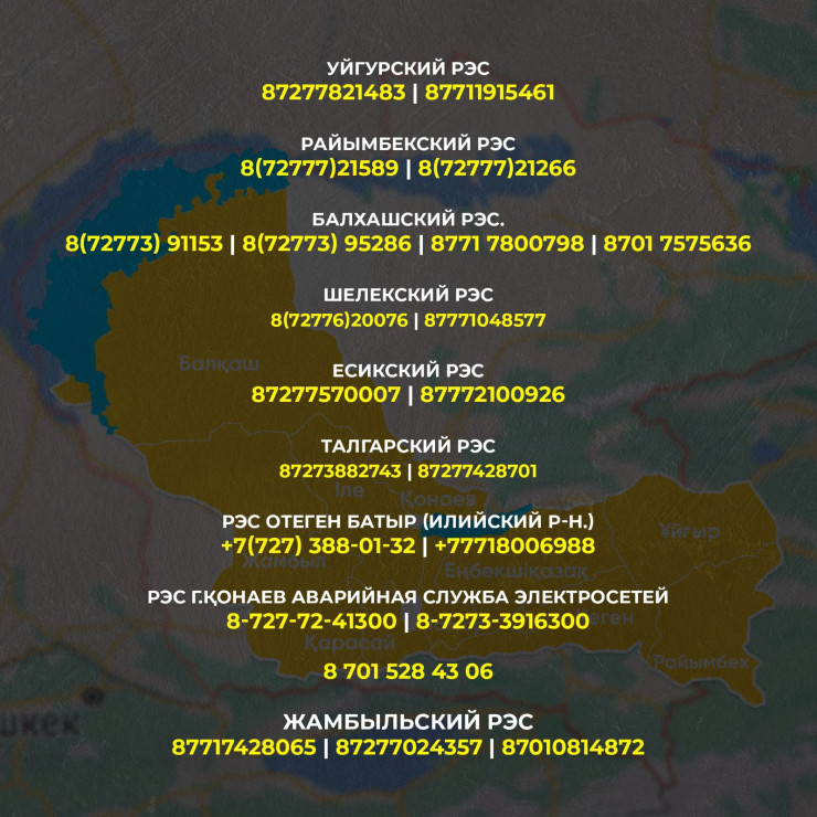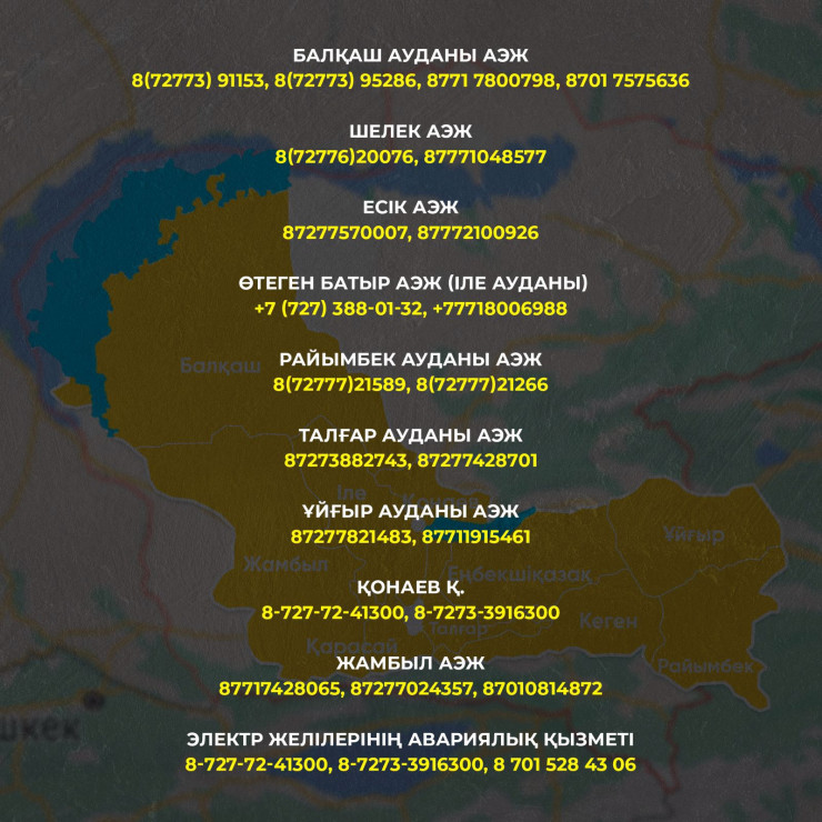 "Уважаемые жители области, в случае отключения электроэнергии в вашем доме вы можете обратиться по номерам диспетчерских служб", - говорится в сообщении акимата.