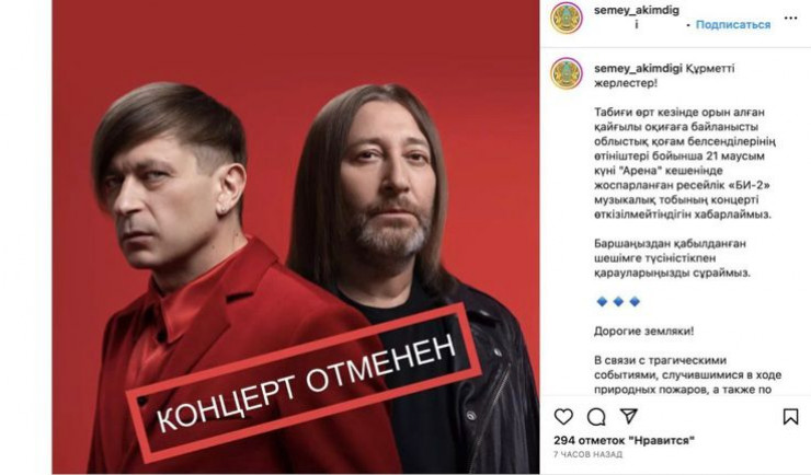 "В связи с трагическими событиями, случившимися в ходе природных пожаров, а также по многочисленным просьбам общественности области концерт российской музыкальной группы "Би-2", запланированный на 21 июня в МКСК "Арена", отменяется", - сообщается на официальной странице акимата Семея в Instagram.