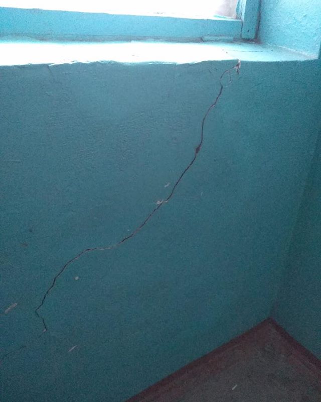 "Девятиэтажный дом 1981 года постройки, 108-квартирный, трехподъездный, конструкция стен кирпичная, фундамент бетонный. В результате визуального осмотра установлено, что есть трещины в несущих стенах лестничной площадки первого подъезда (со второго по девятый этаж). В ходе визуального осмотра были установлены маяки (на каждом этаже). Также с членами комиссии организованы ежедневные дежурства, для наблюдения за развитием трещины, по показаниям которых, ежедневно будут изучаться изменения состояния трещины.