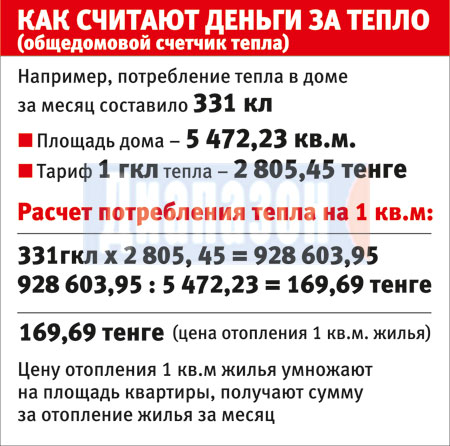 А вот что заявил главный специалист антимонопольного департамента Жаслан Картымбетов. "Тариф утвержден для потребителей, у которых есть общедомовой счетчик тепла и у которых его нет. Для первых цена 2805,45 тенге с НДС за гигакалорию тепла. Вопросы возникли у них. Сумма за отопление у них меняется в зависимости от объема потребления тепла. В октябре это может быть 70 тенге, в декабре-январе, в самый холод, 120-140 тенге. Расчет идет на дом. Показание прибора учета тепла делится на площадь дома, и высчитываются гигакалории тепла на один квадратный метр. Этот показатель умножают на площадь квартиры, выводят сумму за отопление", - сказал он.
