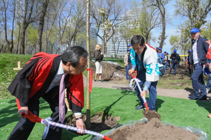 Символ страны восходящего солнца появится вдоль реки Есентай. Первые японские деревья в ходе торжественной церемонии сегодня высадили аким города Бауыржан Байбек и президент японской транснациональной корпорации Tokyo Rope International Сато Казунори.