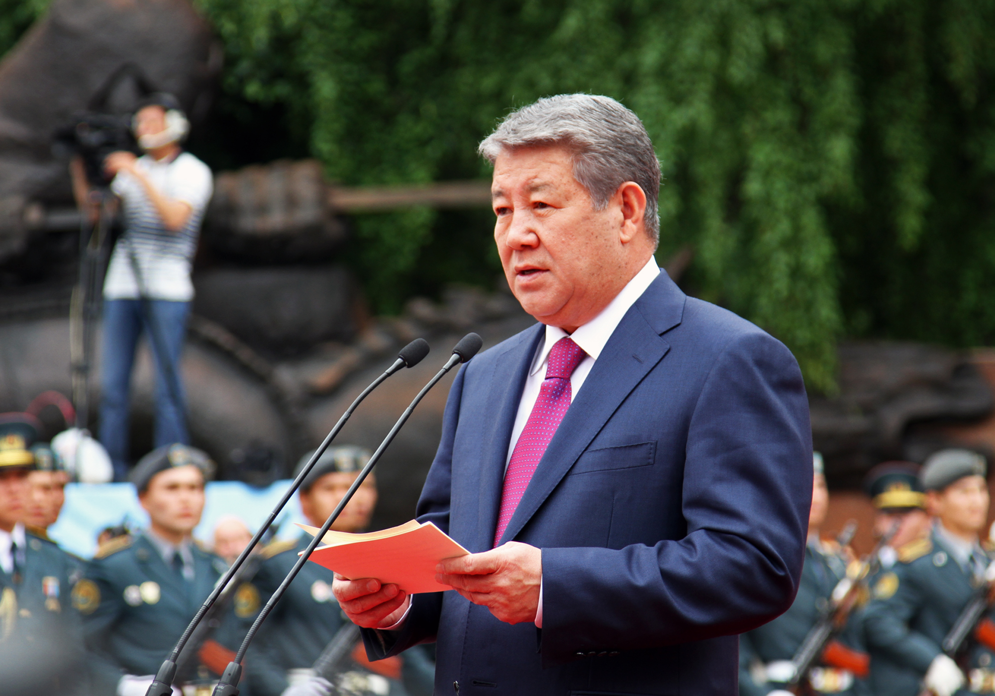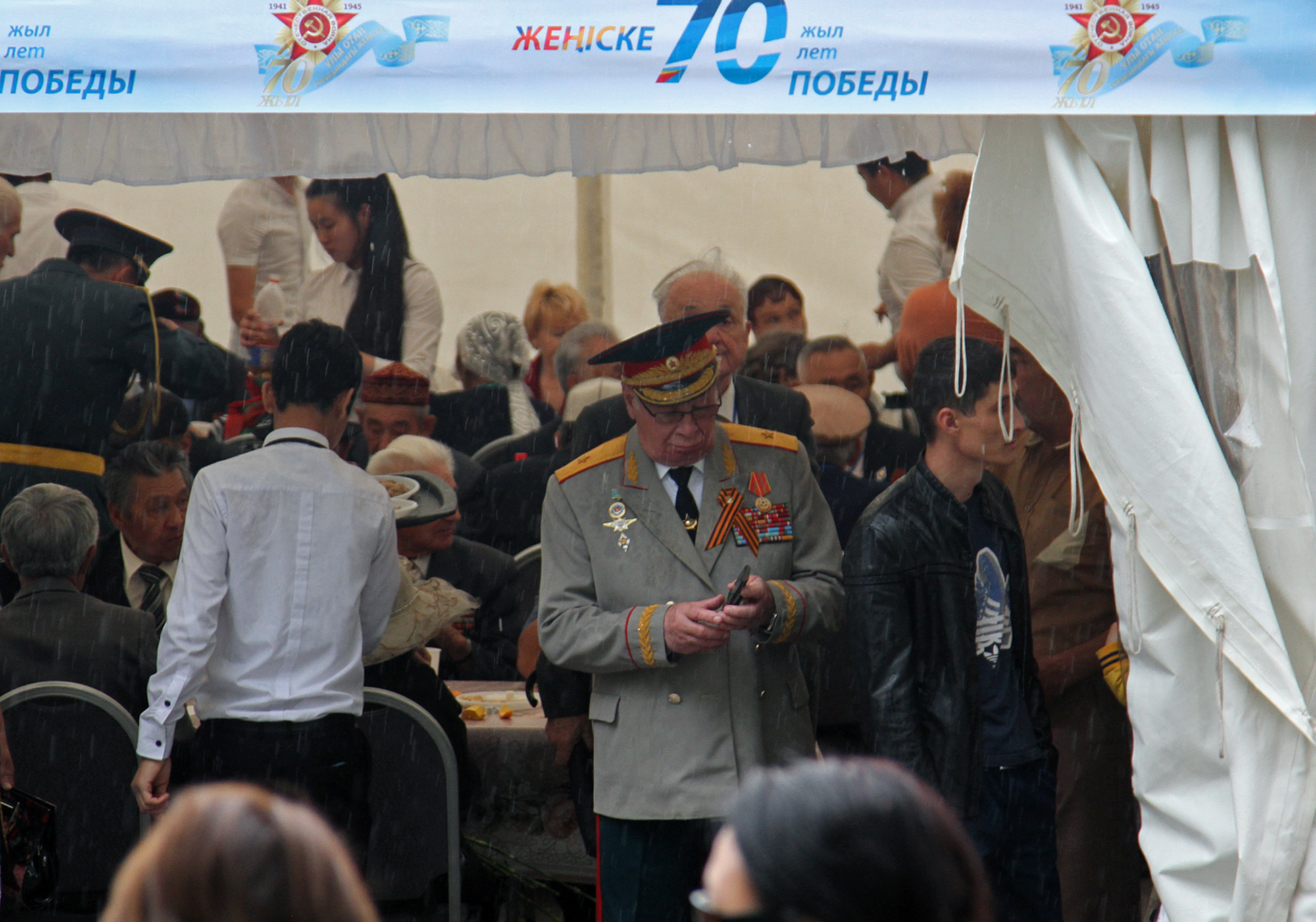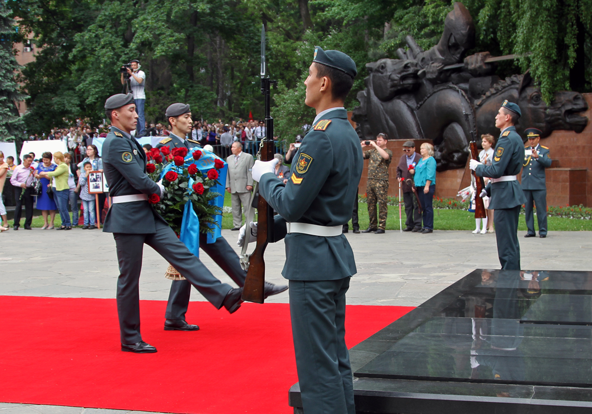 После речи градоначальника прозвучал гимн Казахстана. Затем состоялось возложение цветов. Всего в парк сегодня пришли более 5000 человек, чтобы послушать и спеть песни военных лет. Собравшиеся поздравляли ветеранов и кричали "Спасибо!". В парке организовали праздничный обед для ветеранов и концерт. Полевую кухню развернули возле Свято-Вознесенского собора. Также сегодня, 9 мая, на площади Астана в 20.00 начнется праздничный концерт. А залпы юбилейного салюта будут даны в 22.00 одновременно с двух точек мегаполиса - площади Астана и озера Сайран.