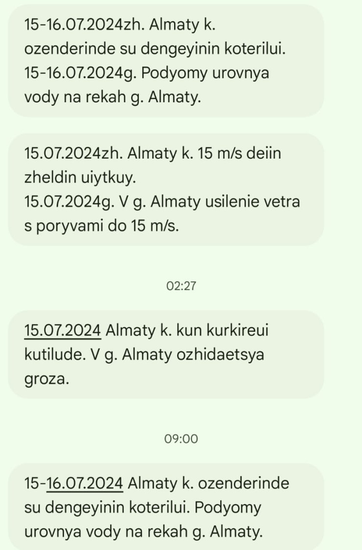 Горожане получили SMS-оповещение от службы 112 о подъеме уровня воды в реках города Алматы 15-16 июля.