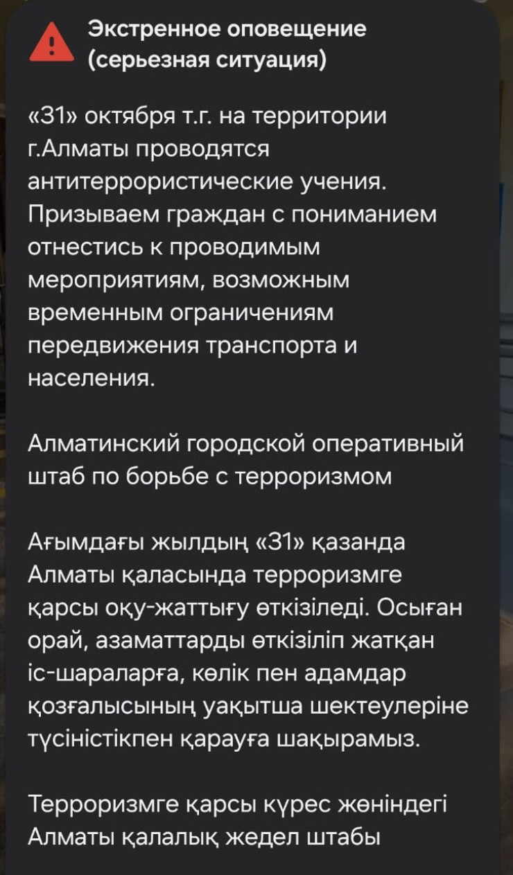 Напомним, утром 17 октября жители Алматы получили президентское оповещение при ЧС - Mass Alert.