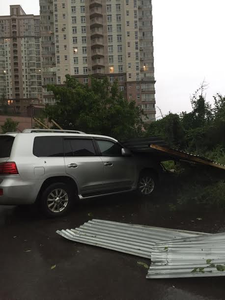 На парковке ЖК Apple Town, который находится на пресечении проспекта Аль-Фараби и улицы Аскарова, забор упал на автомобиль.