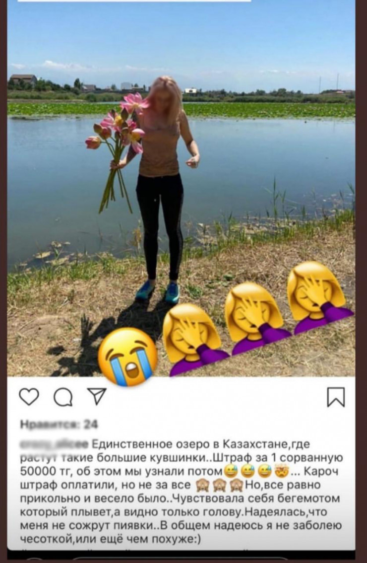 "Каждый день читаю новости и удивляюсь нашим людям. Сегодня увидели в Инстаграме девушку, которая с гордостью выкладывала то, как она лезла через пруд, проваливаясь в воду, но нарвала лотосов. Такие красивые лотосы, которые завозят и разводят у нас в единственном месте, еще и выложила себя с охапкой! Я, честно, не понимаю смысла, ведь она даже до дома их не успеет довезти. У нас осталось так мало красивых мест, которые еще не успели загадить и испортить люди, что даже зачастую не хочется делиться такими чудесными локациями", - возмутилась жительница Алматы Юлия Низамова.