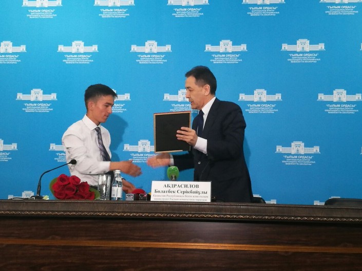 В свою очередь ученик 11 класса Тимурбек Жамаладдинов также поблагодарил учителей, министра и акима Алматинской области, который выделил отважному школьнику грант на обучение в вузе.