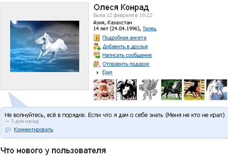 Найденная 14-летняя Олеся Конрад рассказала полицейским, что ушла из дома по собственному желанию. Об этом передает корреспондент Tengrinews.kz со ссылкой на пресс-службу ДВД Алматы. Олеся Конрад 7 февраля ушла в школу, но не вернулась. О пропаже девочки родители сообщили в полицию. Для поиска девочки была создана специальная группа из сотрудников криминальной полиции и инспекции по делам несовершеннолетних. "Мы отрабатывали все версии, встречающиеся в нашей полицейской практике при поиске без вести пропавших лиц. Не исключали вероятность того, что девочка в силу своего переходного возраста могла уйти самостоятельно по собственной воле", - сказал начальник УВД Медеуского РУВД Бахыт Касабеков. Полицейские выяснили, что после внезапного исчезновения Олеся несколько раз звонила родителям и говорила о своем добровольном уходе. Маме девочки удалось договориться с дочкой о встрече, чтобы передать ей теплые вещи и деньги. На встречу вместе с матерью пришли и полицейские. В полиции Олеся рассказала, что ушла из дома по собственному желанию и возвращаться туда не хочет. "Девочка наотрез отказывается называть, где и с кем все эти дни она находилась. А пока мы проводим профилактические беседы с подростком и намерены подключить к этому процессу психологов", - сказал Касабеков. Напомним, девочка на своей странице в социальной сети за два дня до исчезновения написала, что нашла своего брата, с которым не виделась восемь лет. По одной из версий следователя, Олеся могла находиться у него.