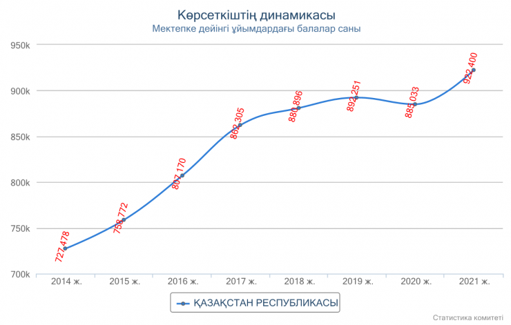 2021 жылғы мәлімет бойынша, елімізде мектепке дейінгі ұйымдардағы бала саны - 922 400. Бұл туралы ұлттық статистика бюросының деректерінде айтылған. Ірі қалалар ішінде Нұр-Сұлтанда - 50 693, Алматыда - 71 664, Шымкентте - 61 099.